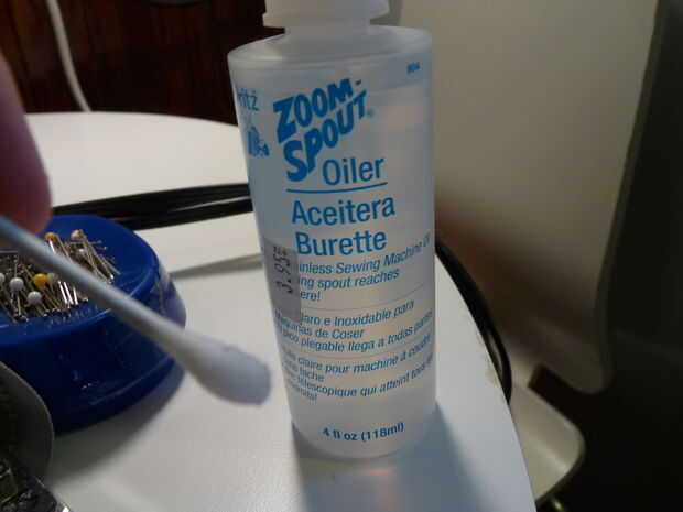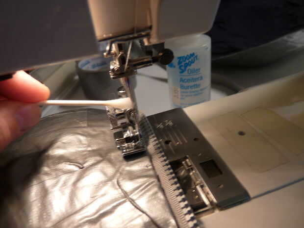 Usted también necesitará frotar el aceite de la q-Tip en la aguja varias veces para poder coser a través de la cinta sin engomar para arriba de la aguja.
