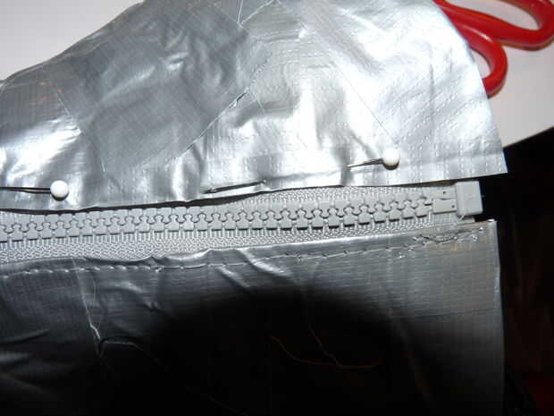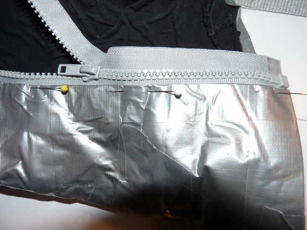 Para recto fijar la cremallera en la polaina, un q-Tip se sumerja en aceite de máquina de coser y frotar los pasadores. Esto permitirá que los pasadores se deslice fácilmente a través del pegamento en la cinta.