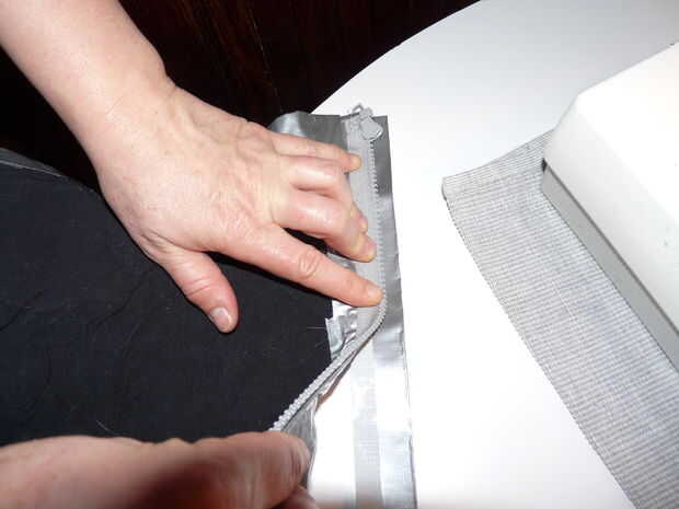 El último paso es crear una superposición con cinta adhesiva para cubrir la cremallera.  Esto le ayudará a mantener la humedad hacia fuera.  Cortar una tira de cinta de la longitud de la cremallera.  Doblar sobre sí misma por lo que sólo 1/2" del borde del pegamento que muestra.  Coloque la tira en el borde delantero de la abertura de la cremallera y reforzar la aleta con otra longitud de la cinta.