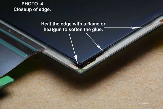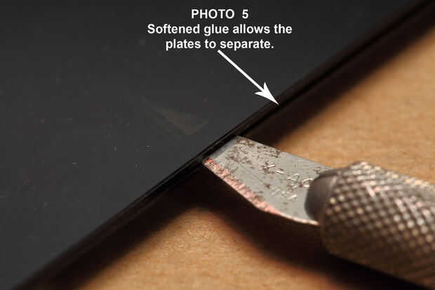 Foto 5 muestra cómo se deslice una hoja a lo largo del espacio entre las sábanas, teniendo cuidado de no ir demasiado rápido o separarlas demasiado. Es fácil de romper una de las hojas de cristal polarizador. El líquido entre las hojas se puede lavar fácilmente, una vez que las hojas se separan.