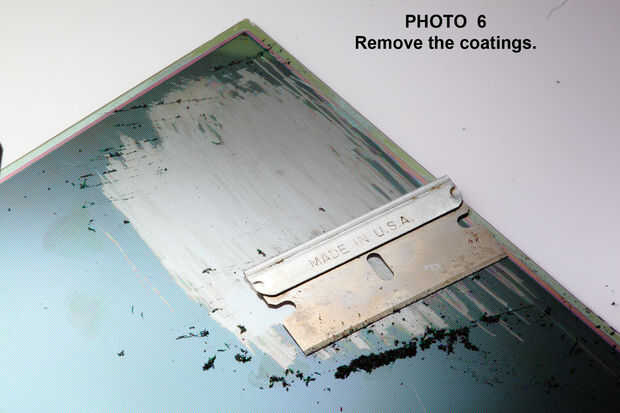 Mientras que el líquido sale con agua, he no podido encontrar ningún solvente que le quite el recubrimiento del electrodo. Pero una hoja de afeitar puede utilizarse para raspar el vidrio, como se muestra en la foto 6.