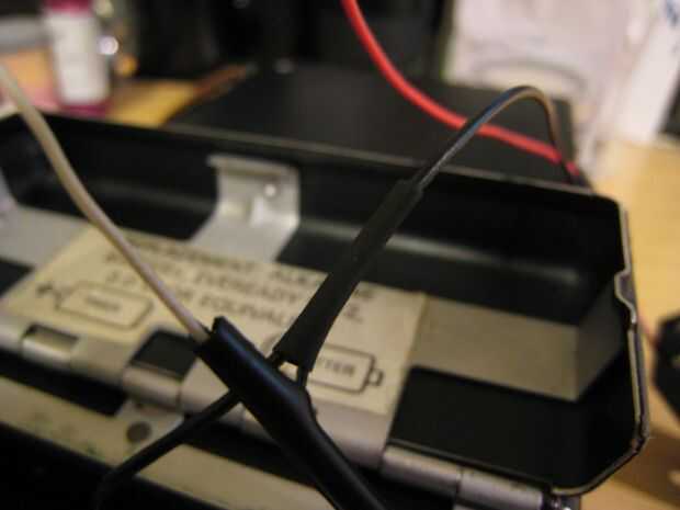 Cuando esto se haya enfriado comprobar los empalmes de la soldadura son aún buenos y enrolle el cable sobrante en el fondo de la bahía de la batería. Luego la línea hasta uno de los orificios en el soporte de la batería con los agujeros ya resinados en la bahía de la batería. Mi titular tenía un agujero en el centro y un agujero de tornillo ya en medio de la bahía que alineados con él muy bien.
