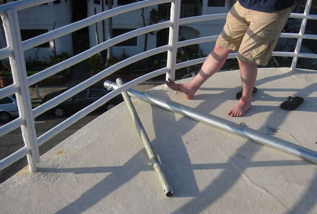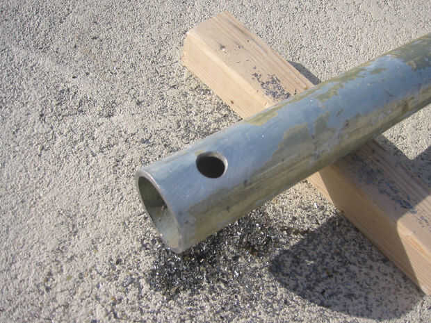 Una vez que se corta al final, usé algún papel de lija para alisar hacia fuera la parte exterior e interior de la tubería. Ahora tenemos a nuestro primer taladro. Lo perforé unos 2" desde el extremo del tubo (el extremo limpio agradable). Una vez que se hizo, necesitaba determinar la longitud. Puse un tornillo a través del orificio y el segundo agujero en el brazo. Esto es sólo para la prueba! Me deslicé hacia fuera sobre el borde y una vez que estaba feliz con la distancia, hice tres medidas: la longitud de donde cortar la tubería, el lugar óptimo para el segundo agujero (aproximadamente 1" del final) y también donde conectar el polo a la barandilla.