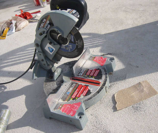 Usé una sierra para cortar ingletes compuestos provista de una cuchilla de corte metal 7". Una vez más, que una persona sostiene el poste. Cortar esta cosa produce una tonelada de chispas! En el futuro, usar guantes al hacerlo, como el tipo de chispas quemado cuando le toca.
