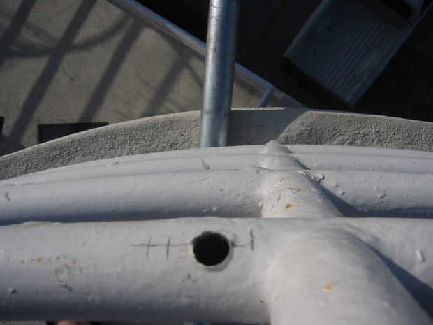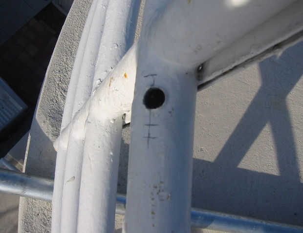 Puede taladrar desde la parte superior o la parte inferior. Elegí perforar desde la parte superior, ya que es donde hice la marca, pero necesitaba inclinarse hacia fuera de la barandilla.