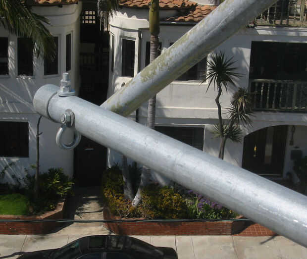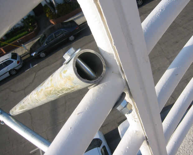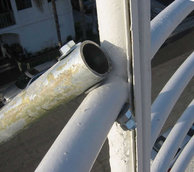 Deslícelo hacia fuera sobre el borde como antes y la levante el tubo de soporte y alinee con el orificio de la barandilla. Una vez es bueno, poner el perno por la parte superior, colocando las arandelas en el medio. Apriete, con dos tuercas.