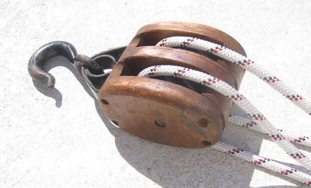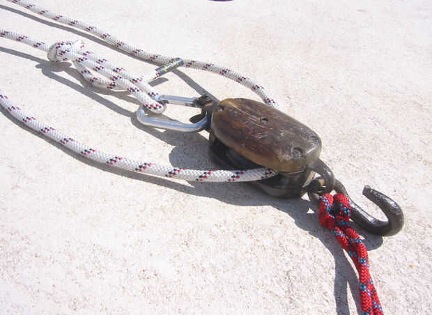 La manera que el sistema de la polea está amañado para arriba, resulta en una brecha por ascensor cuatro de ventaja a la persona en la tierra. Hace uso de más cuerda que un sistema de polea simple, pero de esta manera una persona puede hacer la elevación si necesita. Así que si el objeto pesa 100 libras, sólo necesita poder tirar 25 libras.