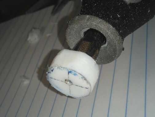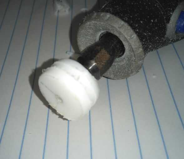 Una vez que gira, puede comenzar a dar forma a la parte final. Obras, del papel de lija y pude apoyar un destornillador contra algo y usarlo para remover el material. Es un truco sucio pero funciona! Después de un cortocircuito mientras que usted debe tener un agradable, perfectamente redondo pedazo de plástico redondo zumbando. Ahora, puede utilizar un archivo o un destornillador afilado para retirar material para formar el canal en el medio. Es casi como si somos maquinistas real! Aunque sospecho nadie que realmente utiliza un torno será la mueca de dolor en mis fotos: P