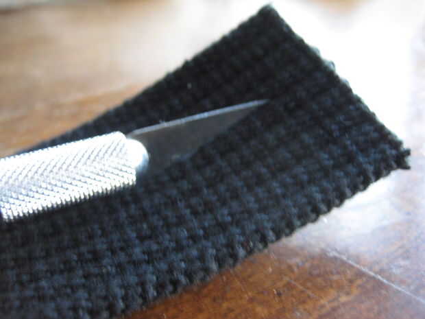 Primero se corta un pequeño agujero en cada extremo que el ojal puede caber en. una manera de hacer esto es cuidadosamente el cuchillo del exacto a través del tejido con la mano buena de la fuerza y luego deslice el exacto cuchillo debajo de una abertura y a través de la otra y corte. Recorte el resto con una tijera.