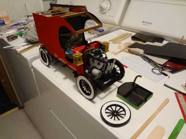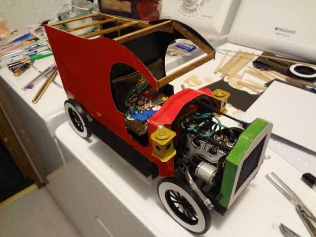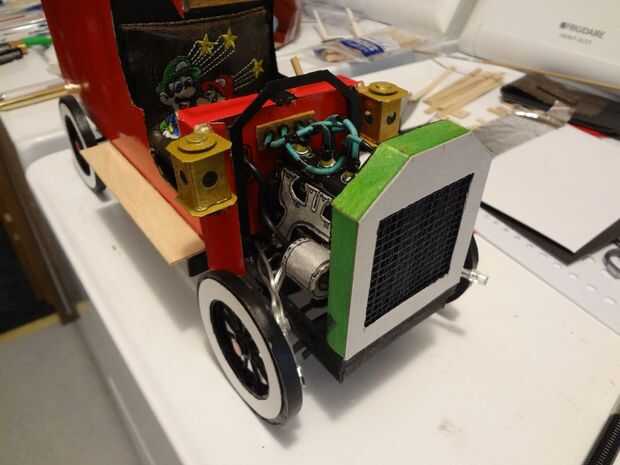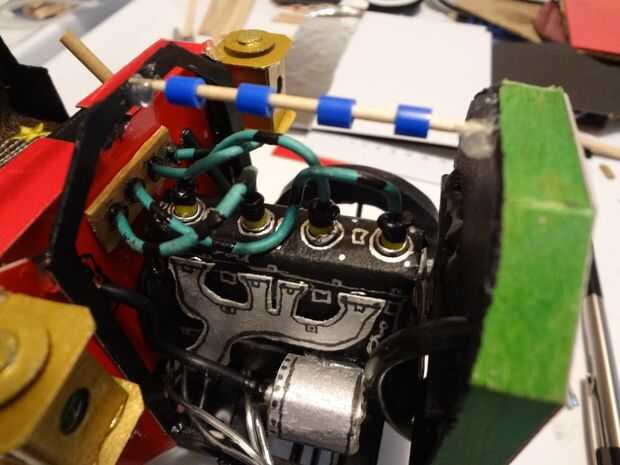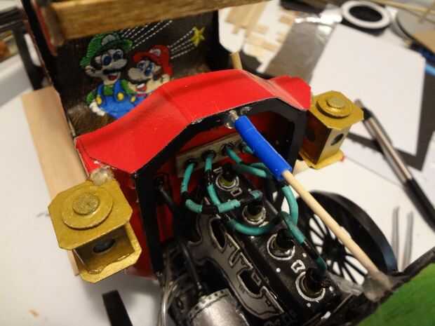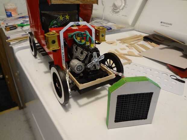 Satisfecho con el compartimiento del motor, me trasladé para hacer el soporte de campana y chimenea que rodea el firewall, así como el radiador. Usé palitos y alambre de la pantalla y acordeón colocado doblaron papel negro por debajo de la pantalla para ver algo así como un núcleo de radiador real. utilicé un viejo alambre de forro como las mangueras del radiador. En este punto he añadido el soporte de campana central usando un palillo de dientes con perler cuentas que actuarían como bisagras para la campana final poder levantar en ambos lados.
