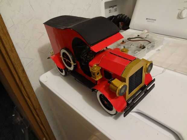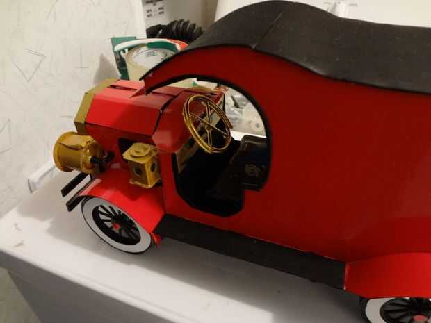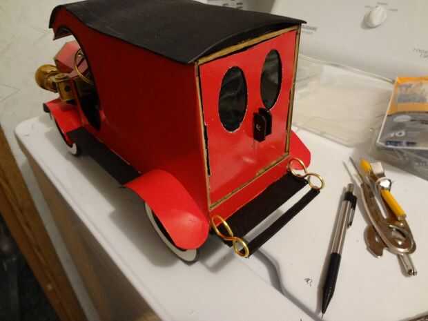 A continuación hice el faro pegado en lugar. Hice la parte delantera y parachoques traseros con 2 diferentes palos de arte tamaño caliente les pega en su lugar y luego la pintura. Usé alambre de aluminio para hacer la rueda de manejo, así como los puestos de lateral parachoques trasero paso.