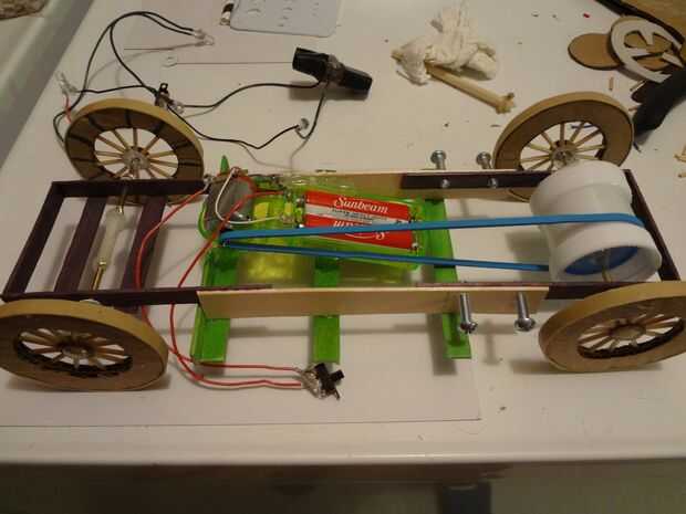 Con los ejes y las poleas instalan. I instalar la rueda con el adhesivo caliente y comenzar a trabajar sobre la instalación del motor eléctrico. Estoy usando un motor de un ventilador personal dólar árbol que requiere 2 rollos de AA. Simplemente utilice el compartimento existente y quitar todo el plástico innecesario. Cable en mi propio interruptor con suficiente longitud de cable para llegar a donde podría montarlo. También tengo el motor en una posición diferente de alambre cortando fuera de la caja.
