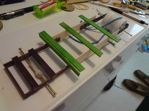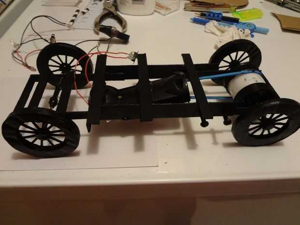 Para hacer la banda fácilmente reemplazable, hice la parte de atrás de los tornillos chassic abiertos y usados para sostener los rieles del eje trasero en su lugar por lo que cuando se rompe una banda simplemente puedo quitar 4 tornillos y deslice la banda de la polea y el eje. Luego pinté el chasis y las ruedas asegurándose de mantener la pintura de los orificios del eje.