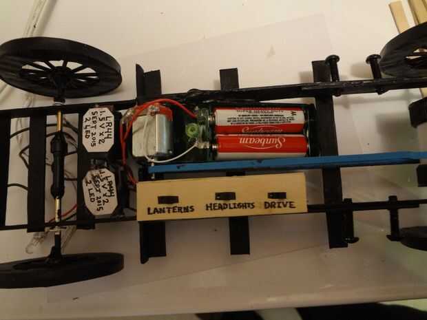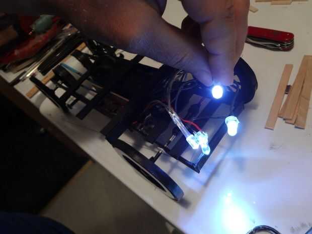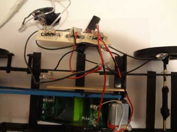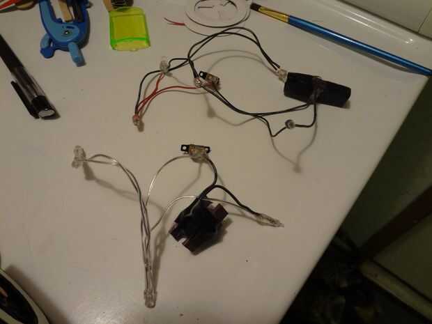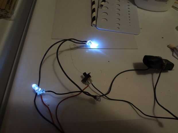 Usé 2 LEDs y 2 pequeño reloj estilo pilas productores de 3 voltios para encender los faros. Luego hice lo mismo para las luces laterales de la linterna. Hice las células batería ejecutando simplemente los cables negativos y positivos el - y + partes de la batería y embalaje cinta aislante alrededor de él todo firmemente. Caliente entonces pegué alrededor de él para mantenerlo en su lugar. Ahora tenía una pequeña batería ligera simple con un - y + cable que sale para conectar a un interruptor. Soldar en el interruptor y LEDs y caliente pegado sobre la soldadura común para mantener hace más fuerte.