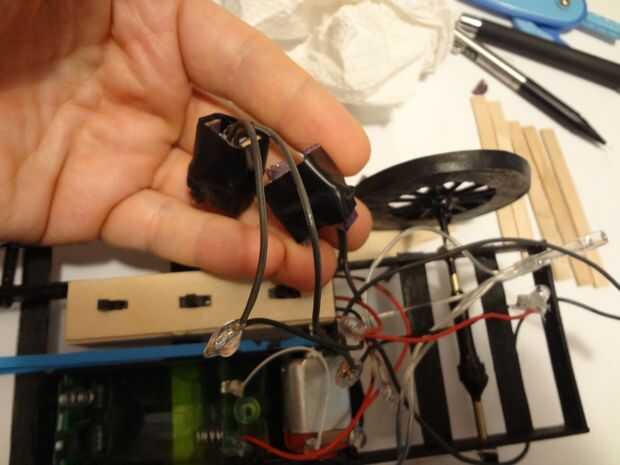 Ahora que tengo los interruptores de los faros, linternas y motor construyo un panel 3 interruptor para los interruptores en la parte inferior del chasis para facilitar el acceso de la casa. Yo utilice un palillo de arte y corte rectángulos en donde los interruptores que vaya usando un cuchillo del exacto. Luego pegamento caliente la parte inferior alrededor del interruptor cableado y soldaduras para mantenerlo todo firmemente en su lugar. Luego caliente de pegamento de la caja del interruptor en el chasis.
