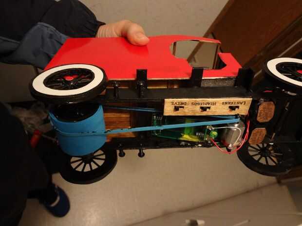 Ahora con el peso extra añadido decido probar como tira. Necesita más esfuerzo de torsión que puede alcanzarse en este punto agregar un eje secundario o hacer la polea más grande. Opté por hacer la polea más grande mediante el uso de hojas de espuma y caliente les pegado alrededor de la cinta scotch rodillo. Esto proporciona el equilibrio perfecto de velocidad y par motor y la espuma también ayudó a la banda hacer un mejor agarre de la polea. Yo he construido varias máquinas de eje múltiple pero con éste trataba de mantenerlo simple, utilizando solo el sistema de polea sencilla y tamaño y el peso de este vehículo permitieron.
