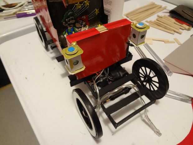 Ahora hacen los faroles de la cartulina y coloque la lente de plástico dentro de y una pintura acrílica oro metálica. I ejecutar los cables a ellos a través del cortafuegos y pegarlos en el lugar.