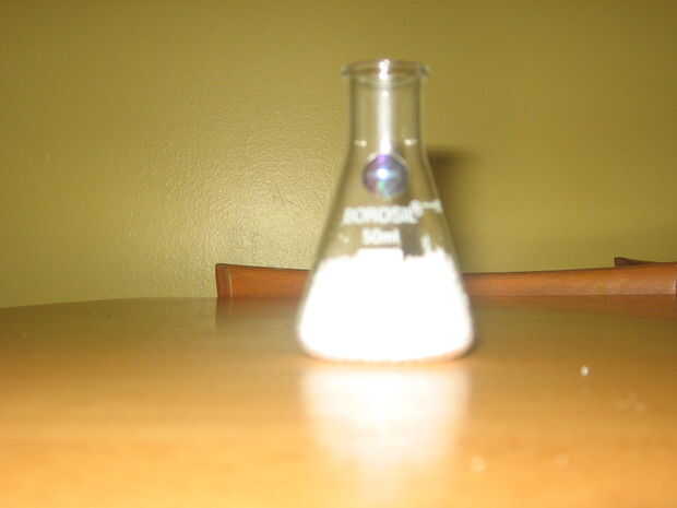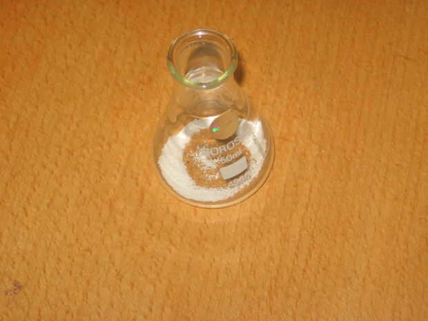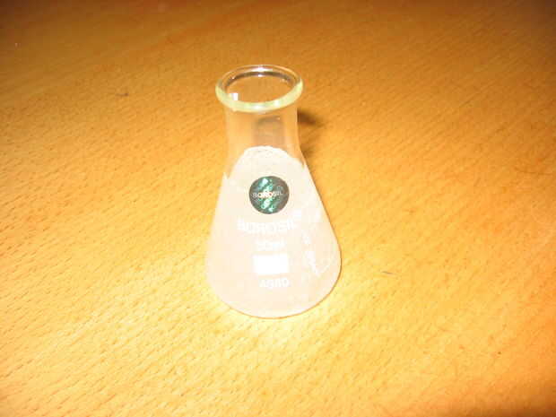 Foto 1: (de izquierda a derecha) cucharilla para polvo, frasco de SPA, matraz Erlenmeyer