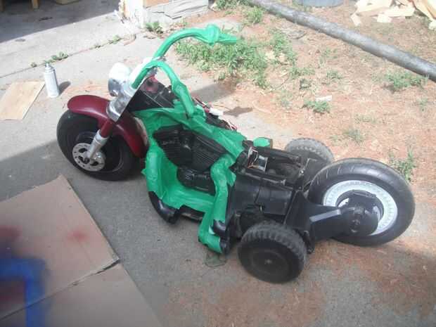 Algunas piezas requieren enmascarar con cinta de enmascarar. El trabajo más importante aquí era el marco de la motocicleta sí mismo - decidí que quería ser chome, en lugar de sólo unas pocas piezas de acento el motor. Apoyado en la cinta de enmascarar como cerca de los contornos del "motor" como pude, luego procedí a tapar todo lo que no quería ser chome. No subestime cuántas rociado generará una lata de pintura - si es una sección dentro de dos pies de lo que va a rociar y no quieres que color, tápelo! Grandes áreas pueden cubrirse con periódico con cinta hacia abajo en todos los lados.
