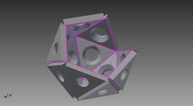 Por desgracia, resulta que el sistema de satisfacción de restricciones de Inventor se descompone en el icosaedro: fácilmente no se hacen con caras triangulares utilizando este método (aunque puede haber trucos de tolerancia de restricción que no he averiguado todavía.) Para construir un icosaedro desde cero, ver mi Instructable siguiente; o puedes hacer lo que hice aquí: crear un icosaedro dual de un dodecaedro y que uso como andamio para caras triangulares.