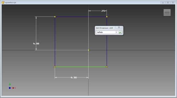 Un cubo es el poliedro más fácil para construir, así que vamos a empezar con eso. Usted puede llamarlo un hexaedro Si suena demasiado simple! Para que sea, comienza con una cara cuadrada como se muestra arriba. Crear un nuevo archivo de parte (.ipt) y comenzar un nuevo dibujo: puede utilizar cualquier plano, pero un Consejo pro es el comando de origen (con la geometría del proyecto) del proyecto en cualquier bosquejo nuevo por lo que siempre es un punto de referencia. Porque queremos un punto en el centro de la cara, vamos a tener el origen en el centro y bordes de dimensión cuatro una distancia igual a como se muestra.
