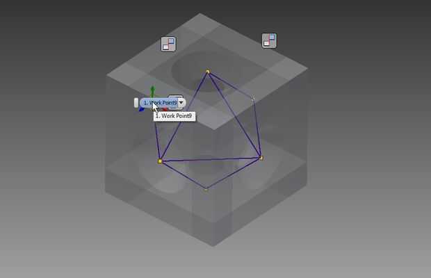 Cada cara de nuestro cubo tiene un punto de centro, convenientemente destacado en amarillo (porque nos proyecta el origen en nuestro bosquejo original de cara). Cada uno es un rincón del poliedro dual del cubo: un octaedro. Para construir este doble sólo tenemos que conectar los puntos: entre ellos está los bordes del octaedro. Molesto, se puede hacer esto en una Asamblea de Inventor; Necesitamos volver a un archivo antes de que podamos esbozar en 3D. Porque la documentación esta tarea aparentemente simple no está actualizada, esto me tomó mucho tiempo averiguar; pero es bastante fácil, además de obtener su nueva octaedro separado hacia fuera en su propio fichero de pieza.