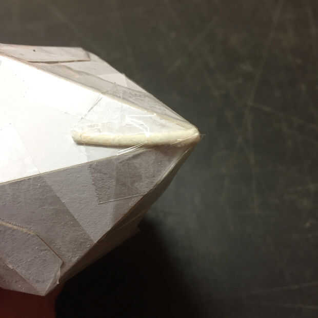 Luego hizo un pequeño agujero para la mecha y ensarta a través, asegurándolo con cinta.
