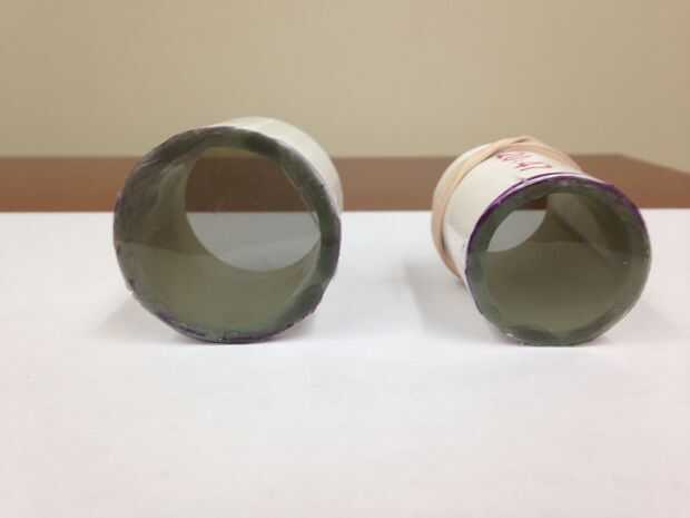 Repita este paso para la otra sección de tubo de PVC. Ahora debe dos secciones de tubo de PVC con película polarizante pegada a uno de los extremos.