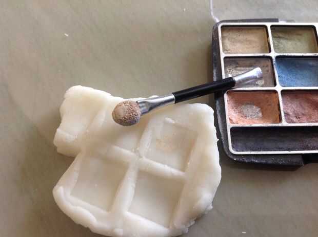 Grad su sombra de ojos y dab la esponja en el amarillo y blancos Aplicar color sólo en el interior de las plazas y los lados de la galleta Frote la esponja en el marrón y aplicar color a crea de barquillos Aplicar una capa o 2 de mod podge o adhesivo para ocultar el color de los barquillos
