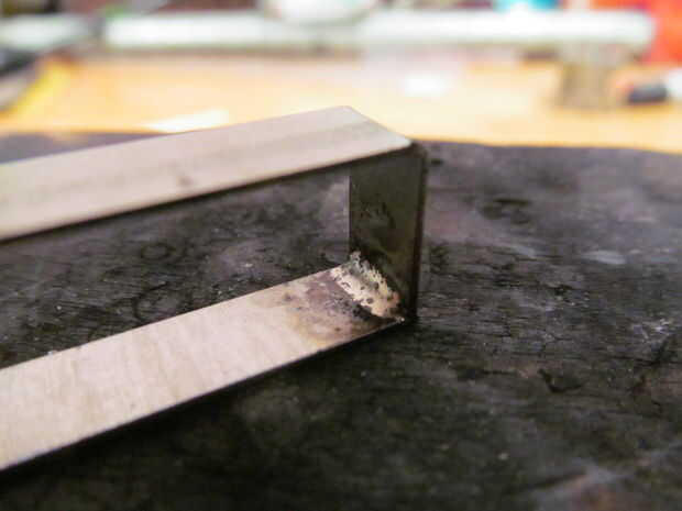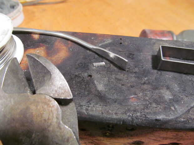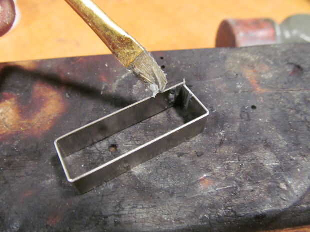 Aplicar soldadura pegada a la articulación. Agregar un pedacito de soldadura de plata. Aplicar calor hasta que se une.