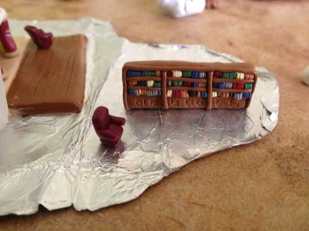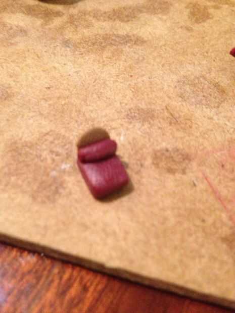 Hacer todos los muebles que desee. Para hacer un sofá, lanzando un trozo de arcilla. Hacer un cubo y poniendo la pieza enrollada de arcilla alrededor de él. También puede hacer puertas una pieza fina de arcilla y cortar un rectángulo pequeño.