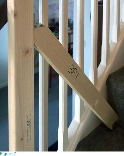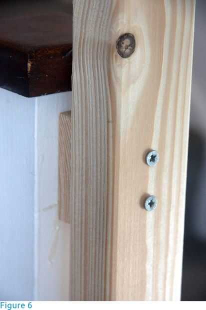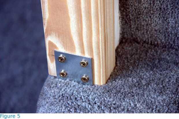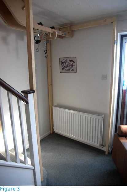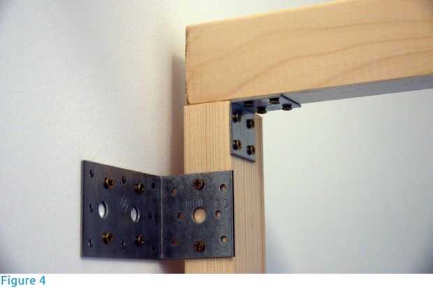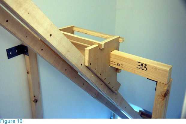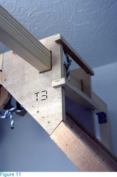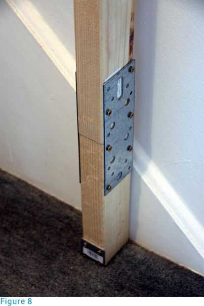 Se construyeron los pórticos de vigas de madera (abeto) de sección transversal de 38 X 63 mm (1.5 en X 2.5 en) y 2,4 m de longitud. Para las vigas transversales, fueron elegidas las secciones con como poco nudos e irregularidades como sea posible. Las vigas descansan en los postes de pórtico (figuras 3 y 4), se llevan a cabo en lugar por acero L-brackets Unido con tornillos en los agujeros pretaladrados y son libres de la curva. No hay otros agujeros debilitan las vigas. Los postes se fijan al piso y escalera con soportes y tornillos (figuras 4 a 6). Si ningún punto de anclaje estaba disponible, el post fue estabilizado con un apoyo de 45 grados (contrafuerte - figura 7). Si la longitud de los postes fue insuficiente, una extensión fue unida con soportes lineales a cada lado (figura 8).