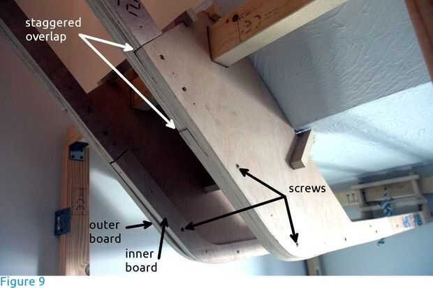 La pista fue construida en tablero contrachapado de madera de 18 mm de espesor (densidad > 400 kg / m ^ 3), tornillos 3.5mmX30mm para madera y pegamento de madera. Perfil de la pista es en forma de L y obtenido uniendo la franja de 40mm ancho interior a la franja de ancho exterior de 50mm de tablero contrachapado con pegamento (aplicado en compresión) y los tornillos a intervalos de 100mm (figura 9). La orientación de los tornillos es alterna (de interior y exterior) y fueron perforados previamente orificios de 3mm de diámetro. Las tiras de tablero interior y exterior fueron escalonadas para proporcionar un área de solape 150mm largo entre diferentes secciones de la construcción.