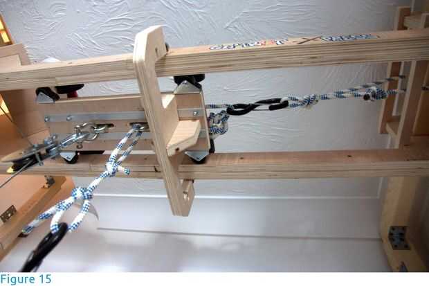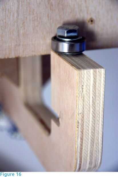El carro estaba hecha de la misma Junta utilizada para la pista. Dos sólidos camiones Skate y ruedas de perfil cuadrado determinan la separación entre los dos lados de la pista. Con sólo 4 mm libres a cada lado, una rueda se basa en 14 mm de pista. La goma de la rueda ayuda a repartir la carga de las cuatro ruedas sobre la pista. Los camiones se sujetan al tablero con los pernos de máquina de acero alta resistencia y tuercas autoblocantes (figura 14). Dos tiras de aluminio fueron utilizadas como las arandelas para los tornillos de 8 y como refuerzo para la placa (figura 15). Cuatro rodillos en los lados del tablero, dos en la parte delantera y dos en la parte trasera del carro, mantener el transporte directamente dentro de la pista dentro de un par de milímetros de tolerancia. Dos placas de anclaje de lazo (de un sistema de giro comercial - figuras 14 y 15) proporcionan puntos de enganche para el cable eslinga y el cabrestante. Para asegurar la retención segura estas pasan por la ranura en el tablero en lugar de ser atornillado sobre él. Un componente en forma de E fue formado fuera de la misma Junta de contrachapado a los ejes verticales de la casa para dos cojinetes del patín (uno cada lado) y los recortes están diseñados para proporcionar la separación mientras se desplazan a lo largo de la pista. Esto fue conectada a la placa con tornillos para madera y reforzada con contrafuertes de madera (figuras 15 y 16). Esto, recuerda, impide la apertura de la pista. Las fuerzas implicadas durante el funcionamiento normal son muy pequeñas, pero porque es un componente crítico intencionalmente sobre-dimensionado lo lo que es no menor de 30 mm en cualquier punto de una. Un gancho de la carabina de retención se une al carro del trasero con línea trenzada de la vela. Un gancho de la carabina de transporte se une igualmente a la parte inferior del carro. El propósito de estos ganchos y varias piezas de línea se muestra en la siguiente sección.