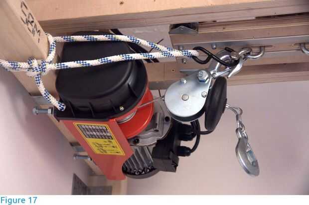 Un estándar comercial polipasto cabrestante (el tipo usado en la construcción de sitios - figuras 17 y 18) fue unida al superior pórtico en un haz dedicado tan alto como sea posible. El haz está orientado con su mayor dimensión transversal horizontal y anclado a los postes de pórtico con los soportes delantero y trasero. El cabrestante se coloca con el carrete de cable centrado en la pista y montado con pernos de acero y tuercas autoblocantes. El cabrestante puede girar sobre su barra de apoyo para dar cabida a la amplia gama de ángulos de cable necesarios para la operación. Por desgracia, el anillo de tope mecánico automático del cabrestante tuvo que ser quitado porque impide un funcionamiento correcto - un encargo uno podría ser modelado posiblemente de madera (pero acaba de salir). La polea con el cabrestante se une al anillo más cercano de transporte (figuras 15 y 17).