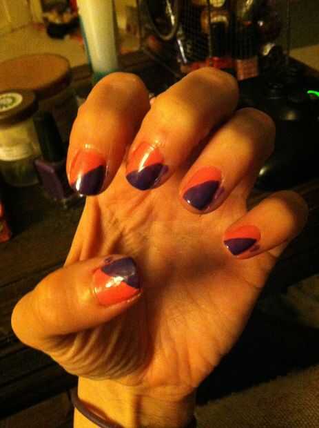 Con un color contrastante la pintura de la parte superior la mitad de la uña en una diagonal. Elegí morado oscuro para esto. Déjelo secar.