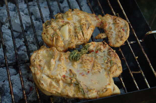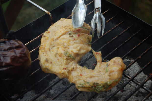 Coloque el pollo en el lado de la carne de parrilla caliente hacia abajo (o arriba si usted está utilizando una parrilla tradicional) durante 3-5 minutos hasta que sale limpio de la parrilla.