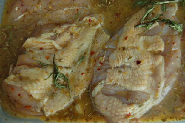 Poner el pollo en el adobo, asegurándose de que se trabaja en la carne. Cubrir y dejar macerar durante unos 20-30 minutos.
