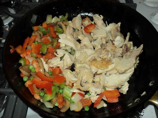 Está bien conseguir algunos pedacitos del pollo frío pegado y dorar en la sartén. Agrega algunos más sabor al plato.