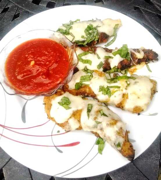 Añadirlo en mozzarella queso dejar derretir, decorar con albahaca y servir con un lado de la deliciosa salsa marinara.