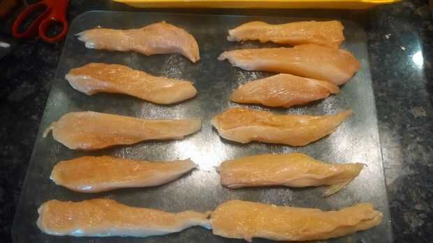 Tome la pechuga de pollo grande y quitar toda la grasa y cositas de él. A continuación cortar cuidadosamente las ofertas como se ve abajo. Tratando de que sean del mismo tamaño.