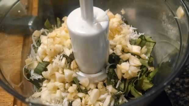 A continuación colocar una olla grande agua con sal a fuego medio, tapa y comience a hervir. Ahora preparar pesto; lugar de ajo, albahaca, parmesano, aceite de oliva, vinagre balsámico y pimentón picado en procesador de alimentos, mezclaran y apartaran.