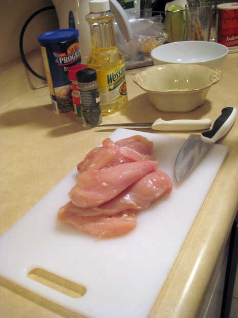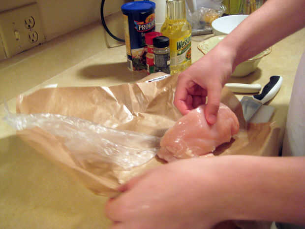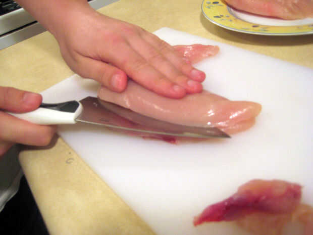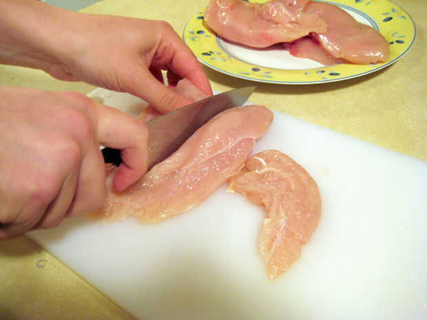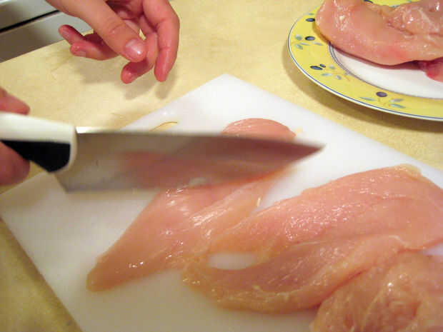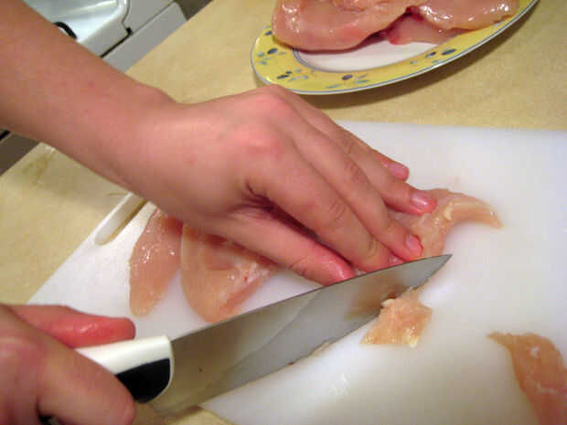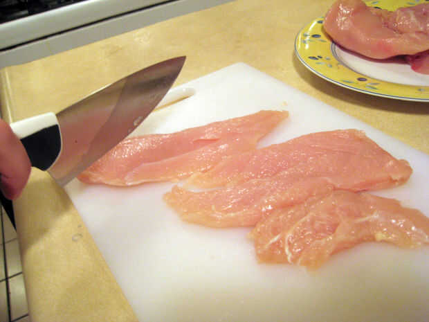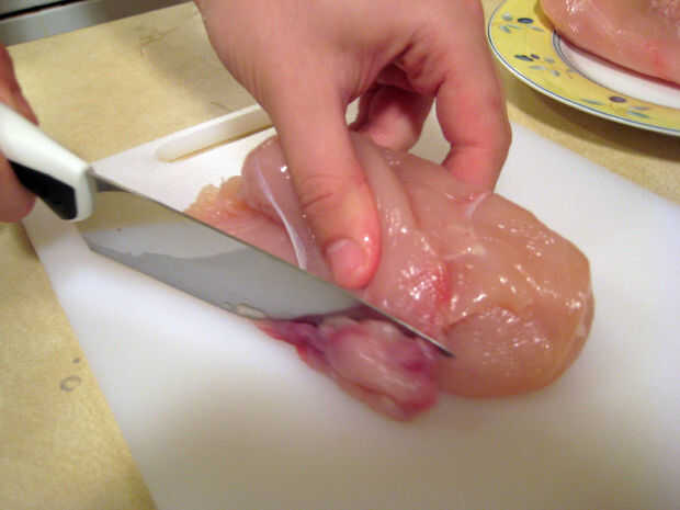 A continuación, cortar la pechuga de pollo por la mitad a lo largo de hacer dos chuletas delgadas y largas.