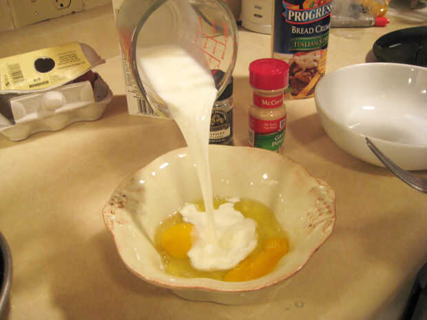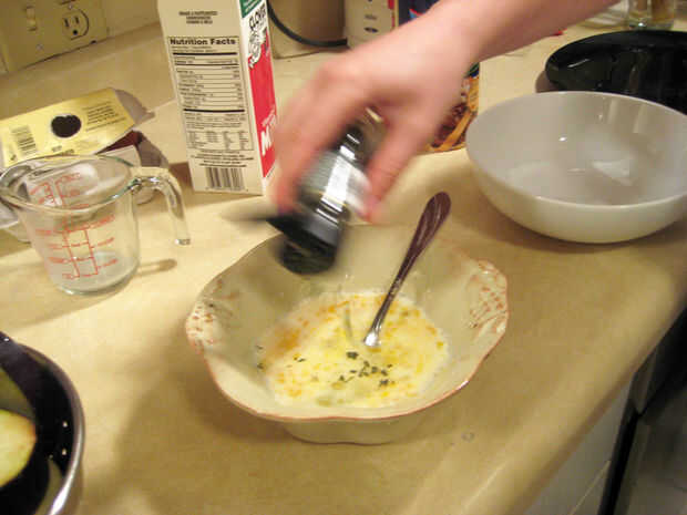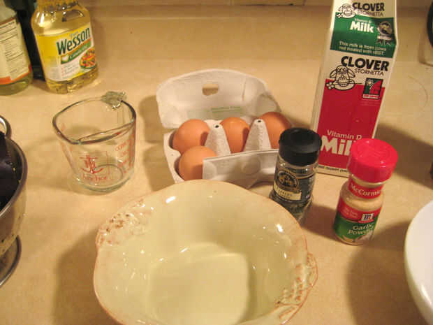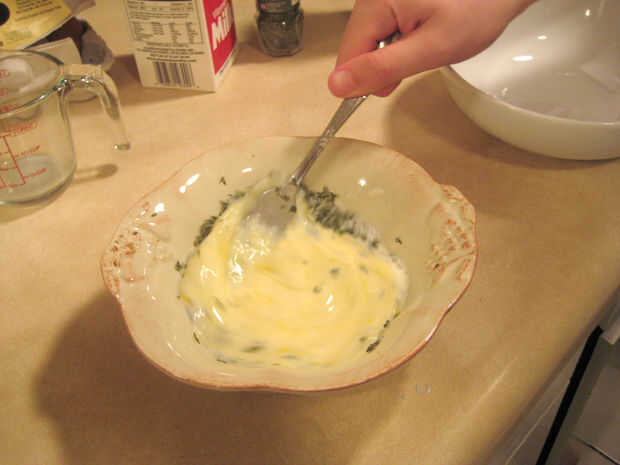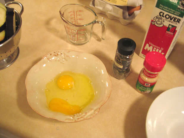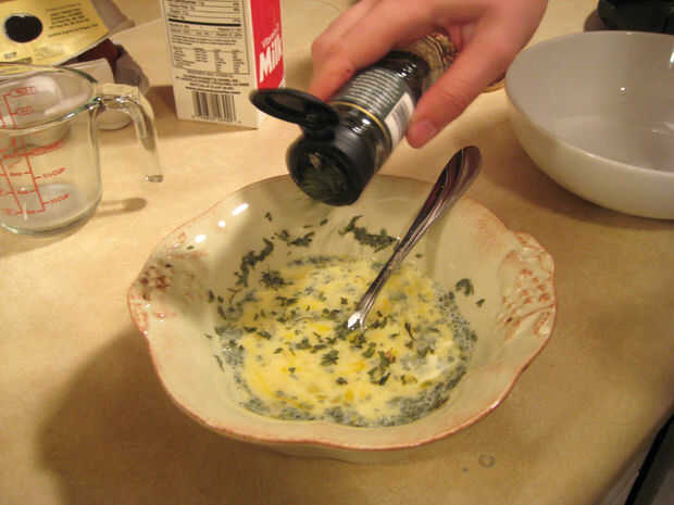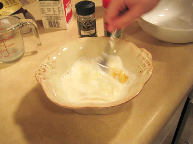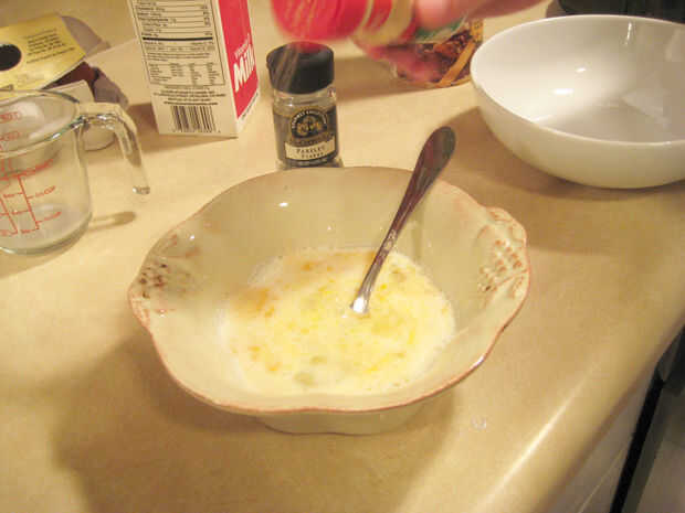 Hacer la masa de huevo mezclando un huevo, 1/4 taza de leche, unos sprinkles de ajo en polvo y una cantidad generosa de perejil.