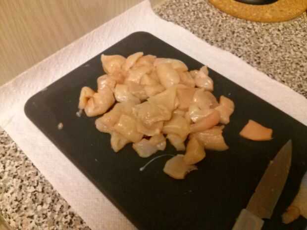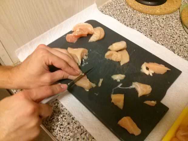 1. lave la tabla de cortar para evitar la contaminación cruzada. 2. Corte el pollo en trozos. Deseche la grasa. 3. Pongas el pollo en la sartén. 4. Lávese las manos y la tabla de cortar.