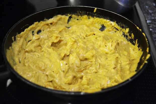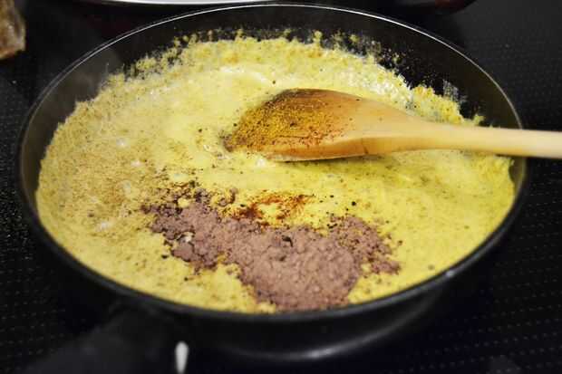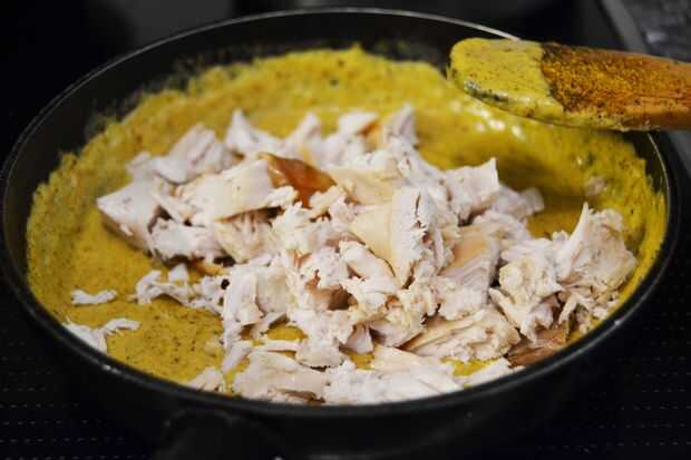 Añadir la nata a la sartén y déjelo durante 2 minutos. Luego, añadir el curry y las especias que tienes elegir, en mi caso, el cacao, la canela, la sal, y ambos tipos de od pimienta. Mezclar todo muy bien con una cuchara de madera y añadir el pollo. Mezclar otra vez y usted consiguió!