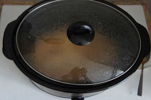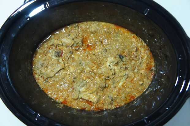 4) cerrar y cocinar en la olla para 8 horas en baja o hasta el pollo se cocina bien y el aceite comienza a separarse.
