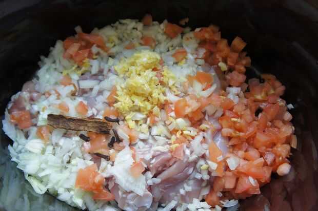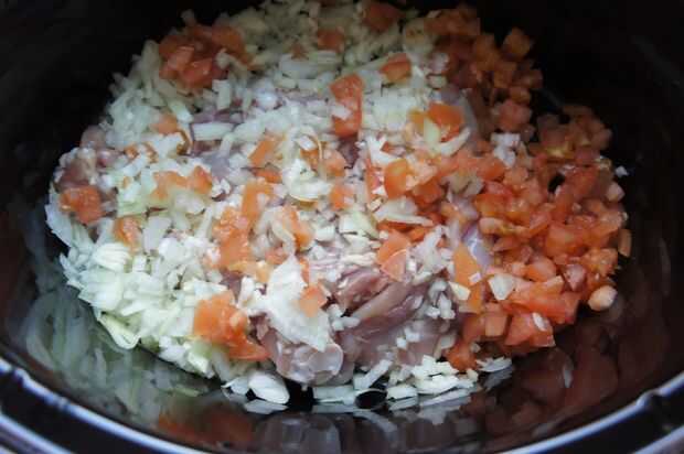 1) en la olla, añadir el pollo, cebolla finamente picada, tomate picado y mezcla