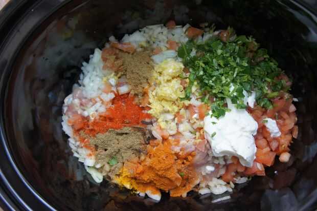 2) luego agregar ajo machacado jengibre, Chile en polvo, cilantro y comino en polvo, polvo de la cúrcuma, garam masala, curry en polvo, canela, clavo, yogur, cilantro, sal, aceite y mezcla bien.