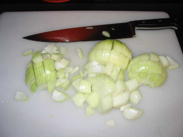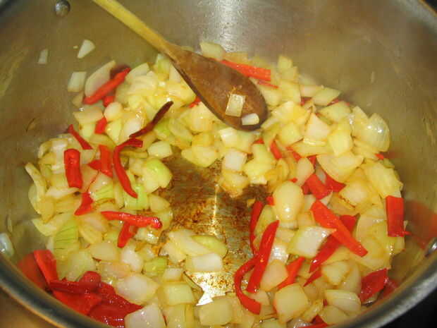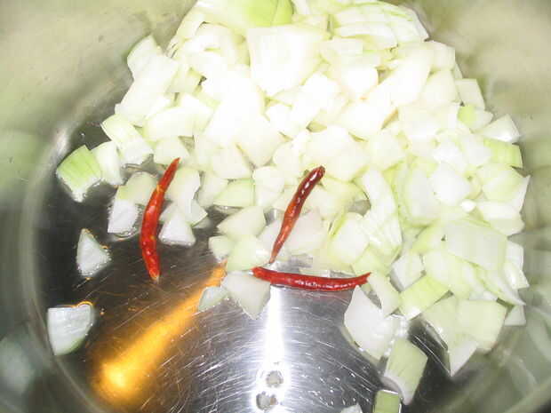 Añadir las cebollas y chiles secados a la olla con aceite de canola y removemos mientras se pica el resto de las verduras.